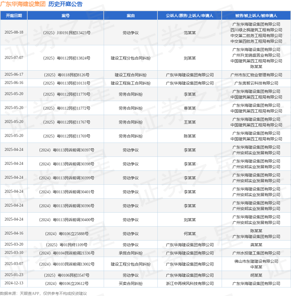 案号:(2025)粤0118民初8126号审理法院:广州市增城区人民法院案由:建设工程合同纠纷当事人信息: 原告/上诉人:广东华海建设集团有限公司 被告/被上诉人:广州市东汇物业管理有限公司开庭日期:2025年6月17日根据统计,近一年内以广东华海建设集团有限公司为当事人的历史开庭公告有38则,其中案由为“劳动争议”的公告以13则居首,其次为“买卖合同纠纷”有9则,“劳务合同纠纷”有4则。历史开庭公告(前20条)如下: