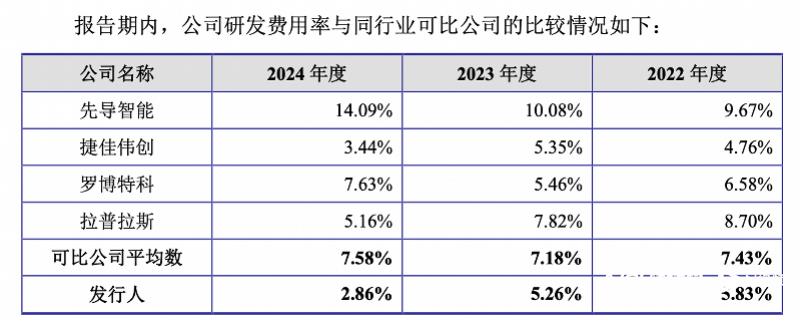 可以看到,相同报告期内,可比公司研发费用率平均数均高于江松科技,特别是2024年,领先幅度较大。并且,以投入金额比较,可比公司也基本高于江松科技。如捷佳伟创2024年研发费用达6.48亿元。