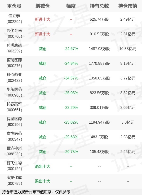 本站消息金砖财富,7月18日银华基金旗下马君 王帅管理的银华中证创新药产业交易型开放式指数基金公布中报,近1年净值增长率38.3%。与上一季度相比,该基金前十大重仓股新增信立泰,通化金马;其中药明康德持仓占比10.92%,为该基金第一大重仓股;智飞生物,康龙化成等退出前十大重仓股;详细数据如下: