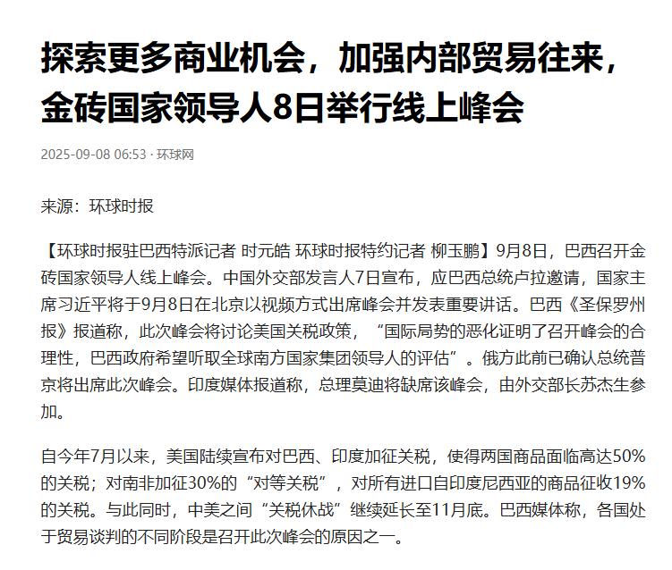 探索更多商业机会蜂窝配资,加强内部贸易往来,金砖国家领导人8日举行线上峰会——2025-09-08 06:53·环球网