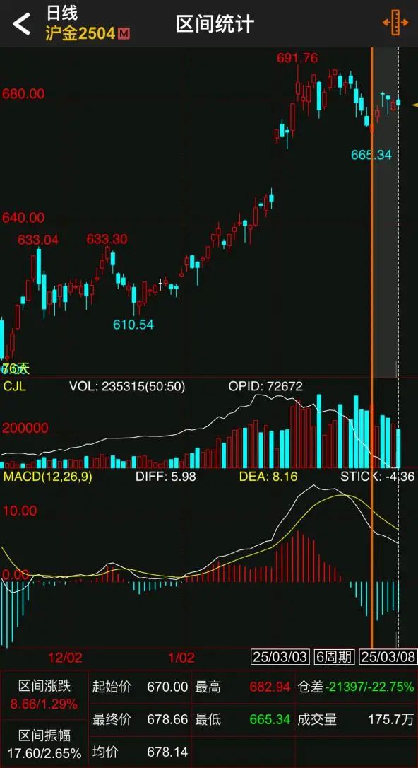 沪金主力合约价格方面,在3月3日最低触至每克665.34元后,连续震荡上扬,3月份以来累计涨幅为1.29%。