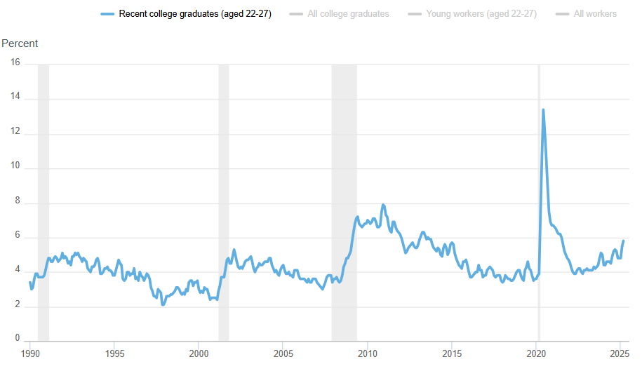 数据显示,尽管目前美国整体失业率仍稳定在4%左右的较低水平,但对22–27岁的应届生来说,失业率已接近6%,20–24岁更是逼近7%,为新冠疫情爆发以来的历史最高水平。