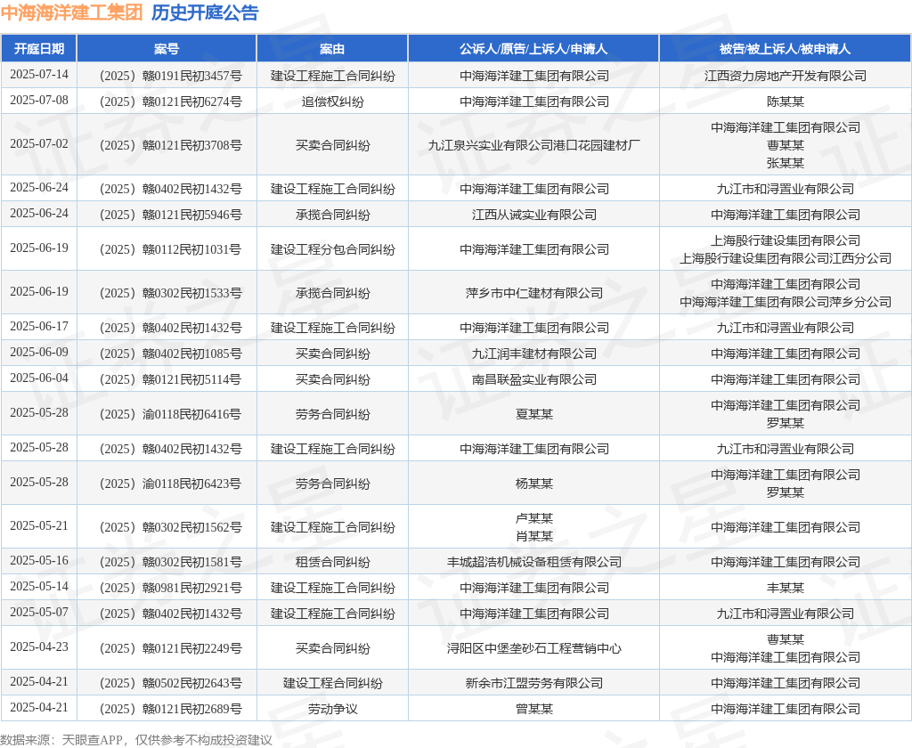 案号:(2025)赣0402民初1432号审理法院:九江市庐山区人民法院案由:建设工程施工合同纠纷当事人信息: 原告/上诉人:中海海洋建工集团有限公司 被告/被上诉人:九江市和浔置业有限公司开庭日期:2025年6月17日根据统计,近一年内以中海海洋建工集团有限公司为当事人的历史开庭公告有83则,其中案由为“买卖合同纠纷”的公告以34则居首,其次为“建设工程施工合同纠纷”有17则,“租赁合同纠纷”有6则。历史开庭公告(前20条)如下: